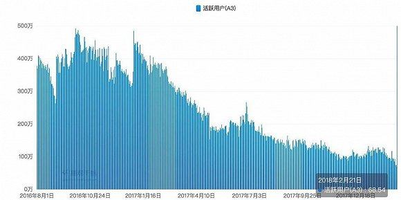 这使得映客陷入了收入困境:一方面,映客的商业化之路并不顺利,另一方面随着月活下降,直播业务收入也会随之减少,根据此前映客直播的公开数据显示,2016年10月,映客直播的下载量超过一亿次,日活量超过1500万,日前网上曝光一张映客直播的日活数据图显示,2018年2月21日,映客用户活跃量仅有68.54万。