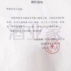 调价通知中显示,调价是由于原材料及运输成本等都大幅度上涨,是为了规范市场价格体系。且针对的是500ML装。同时,该通知还提出,常规力度10箱送4箱。