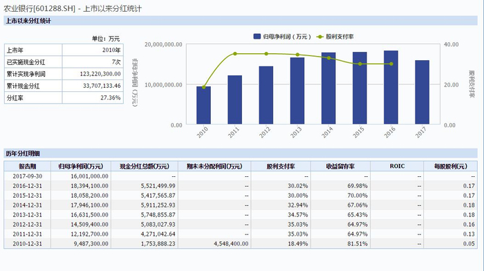 要花1000亿元投资农业银行,投资回报如何呢?每日经济新闻(微信号:nbdnews)查询Wind数据显示,从2010年上市到2016年止,农业银行累计现金分红约3370亿元人民币。2012年-2016年,现金分红都超过了500亿元。