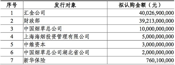 除了募资规模大,这次参与定增的机构也个个来头不小:汇金公司、财政部、中国烟草总公司、上海海烟投资管理有限公司、中维资本、中国烟草总公司湖北省公司、新华保险。