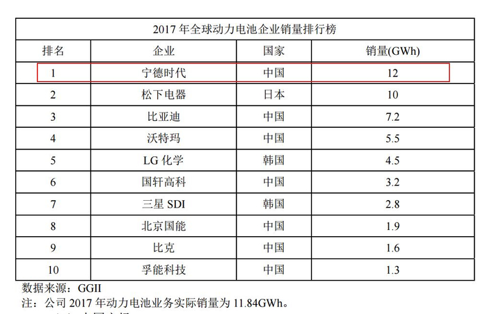 根据招股数披露的信息,公司2017年动力电池的销量为11.84GWh,在全球排名第一,排名第二、第三的松下、比亚迪的销量分别为10GWh和7.2GWh。