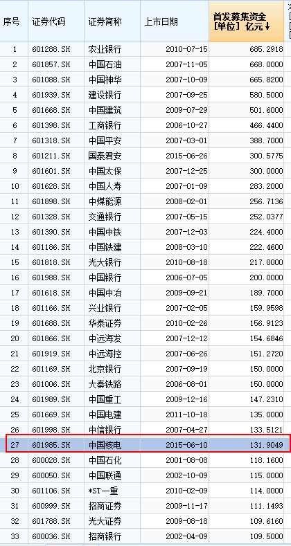 即使涵盖所有金融地产、石油石化及各类国企,宁德时代的首发募集资金,也能排在中国核电旁边,位居第28名。