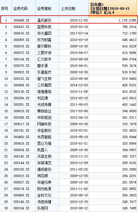作为新兴产业聚集的创业板,目前最大市值企业为生猪养殖的温氏股份,该公司最新市值为1179亿元(3月13日),也是创业板唯一一家市值过千亿元的企业。排在温氏股份之后的,蓝思科技、华大基因、东方财富的市值均不到800亿元。