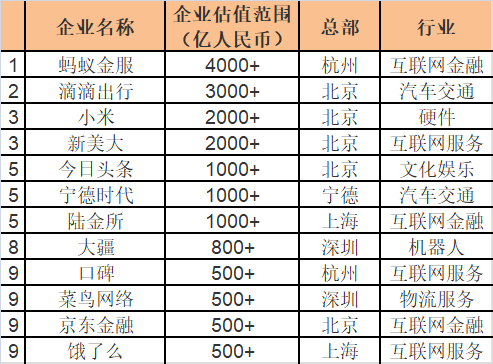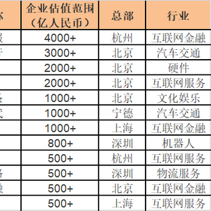 大中华区独角兽企业Top10。最新发布的《2017胡润大中华区独角兽指数》显示,宁德时代以1000亿估值排名第五,是雷军小米的一半估值。