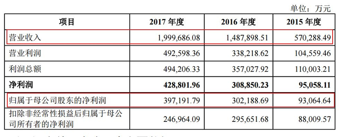 公司的营业收入从2015年的57亿元快速增至2017年的约200亿元,净利润从2015年的9.3亿元增长到2017年的约40亿元。