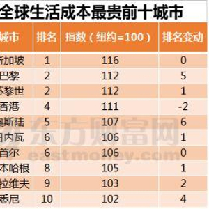 根据报告,今年生活成本最贵的十大城市依次为:新加坡、巴黎、苏黎世、香港、奥斯陆、日内瓦、首尔、哥本哈根、特拉维夫、悉尼。