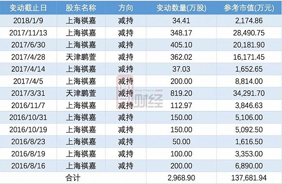 2016年8月以来,上海祺嘉股权投资合伙企业(有限合伙)以及天津鹏萱股权投资基金合伙企业(有限合伙)持续减持,合计减持2968.9万股,参考市值约13.77亿元。其中,天津鹏萱已不再持有上市公司股权。以下为各股东减持情况: