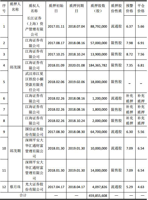 股东邱茂国1390万股限售股已跌破7.56元/股平仓线。邱茂国2017年10月25日将1390万股限售股抵押给江海证券有限公司,该部分股权2018年10月24日质押到期。