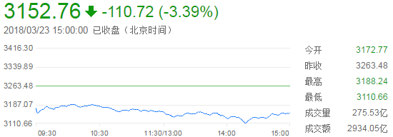 截至沪深股市全天收盘,上证综指收报3,152.76点,下跌110.72点,跌幅3.39%,成交额2,934亿元;深证成指收报10,439.99点,下跌437.26点,跌幅4.02%,成交额3,419亿元;创业板指收报1,726.02点,下跌91.21点,跌幅5.02%,成交额1,043亿元。