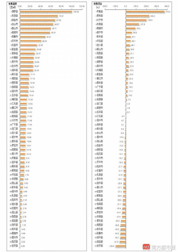 从同比变化看,32县/市同比有所下降,余下25个县/市同比有不同幅度增长,其中怀集、惠来、兴宁、东源的同比增幅超过100%。