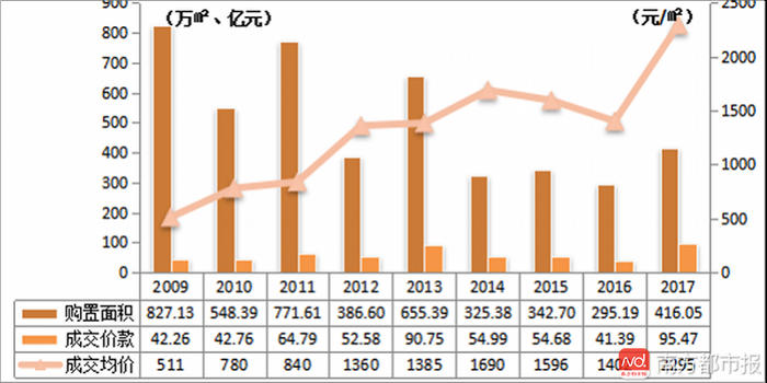 从2009~2017年的数据看,2017年的土地购置面积明显低于2009~2011年和2013年的购置面积,仍处于低位,但相比2014~2016年有所回升。但2017年县域土地成交均价的大幅上涨,表象上体现了土地资源流通价值的上升,本质上则反映出了行业市场正由城市向县域渗透的趋势,未来以城市群为单元的土地价值也将趋于扁平化。