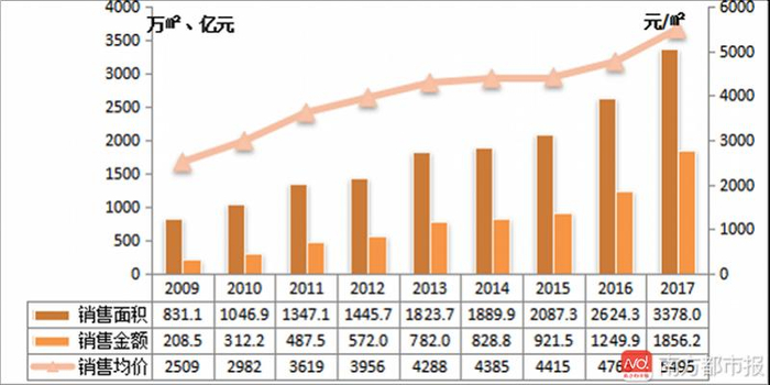 2017年,广东省县域商品房销售面积和销售金额达3378万平方米和1856亿元,同比分别增长28.7%和48.6%,增速分别比全省高19.5个百分点和32.7个百分点;销售均价5494元/平方米,同比增长15.4%,高出全省9.3个百分点,均创下历史新高。