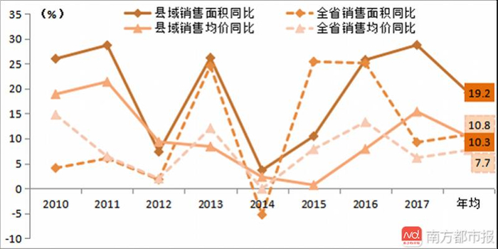 数据显示,2009~2017年间,县域商品房销售销售面积年均增速达19.2%,高出全省总体水平8.4个百分点;销售均价年均增速为10.3%,比全省平均水平高2.6个百分点。商品房销售面积和销售金额占全省比重由2009年的11.8%和4.5%,升至2017年的21.2%和9.9%,分别提升9.4个百分点和5.4个百分点。