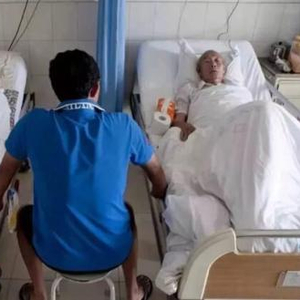 右手是爸,左手是妈,儿子坐在中间,守护着自己的父母。一家三口在医院的病房里相互凝视,很无助也很无奈。
