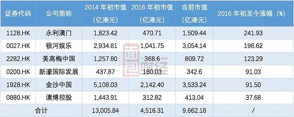 除了业绩始终没有起色的澳博控股外,其余五家2016年至今股价涨幅均超过90%。