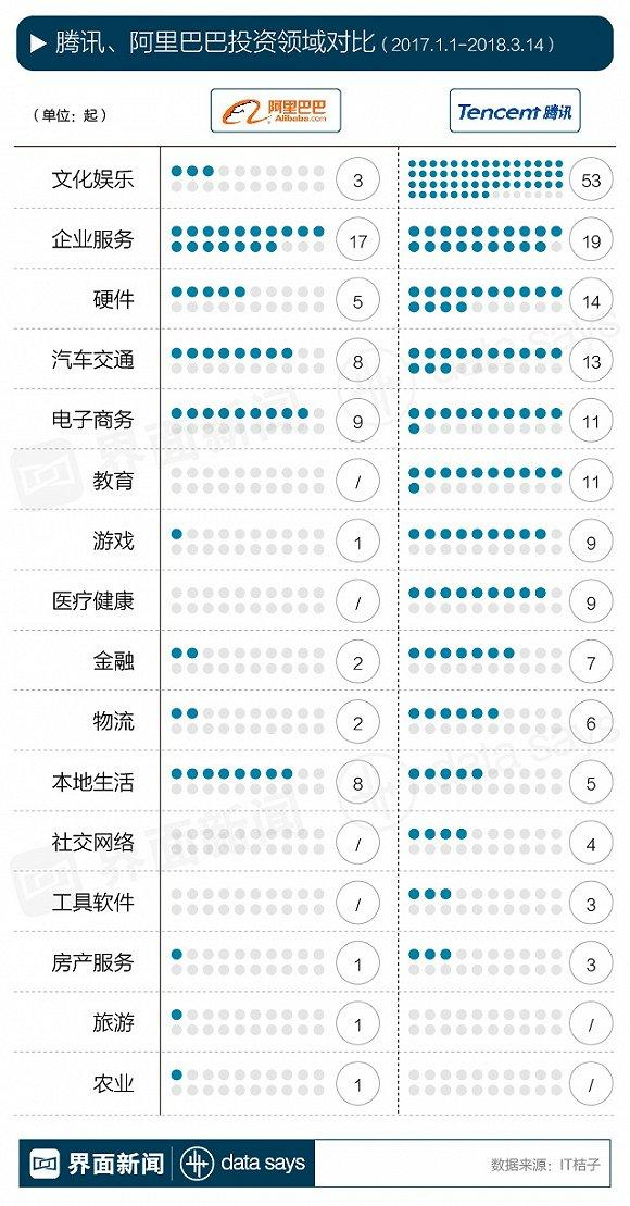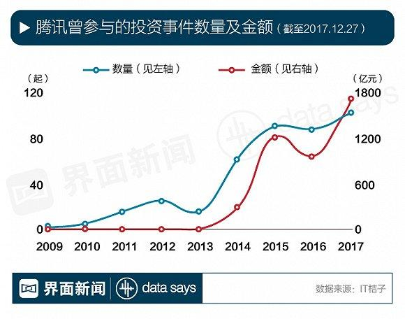 据界面新闻此前报道,自公司成立之日至2017年12月27日,腾讯共对外进行了483笔投资,超过阿里巴巴的296笔。
