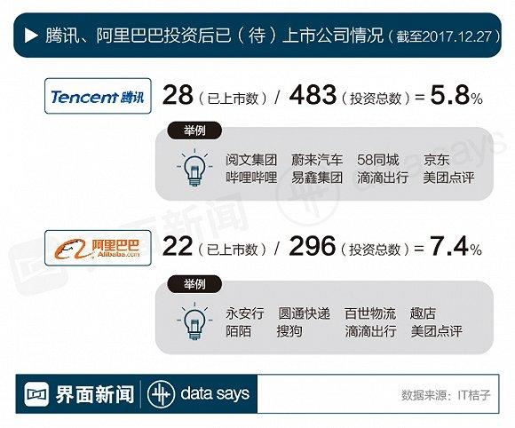 在腾讯和阿里巴巴投资的公司中,分别有28家、22家已经上市或进入待上市状态,投资上市率分别为5.8%、7.4%。