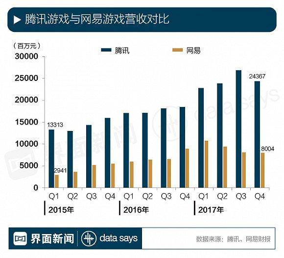 腾讯在财报中称,2017年,腾讯网络游戏收入增长38%至978.83亿元,主要是受智能手机游戏(包括《王者荣耀》等现有游戏,和《魂斗罗:归来》、《龙之谷》、《经典版天龙手游》等新游戏)收入的增长所推动。