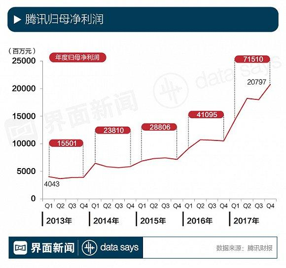 游戏收入占比下滑财报显示,2017年全年,腾讯总收入为2377.60亿元,比去年同期增长56%。公司权益持有人应占盈利(归母净利润)为715.10亿元,比去年同期增长74%。