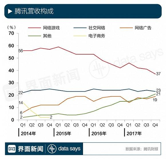 观察历史数据,腾讯近年的游戏收入占比在不断降低。