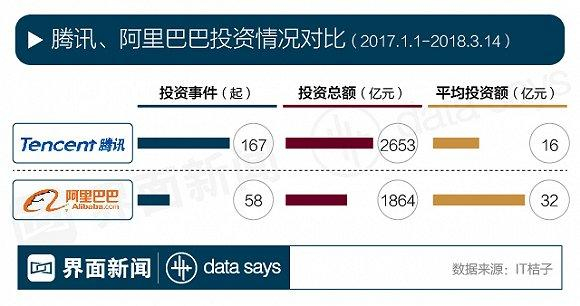 IT桔子数据显示,自2017年初至2018年3月14日,腾讯对外进行了167笔投资,投资总额超过2600亿元。阿里巴巴虽然投资事件数和投资金额都没有腾讯多,但平均投资额是腾讯的2倍。