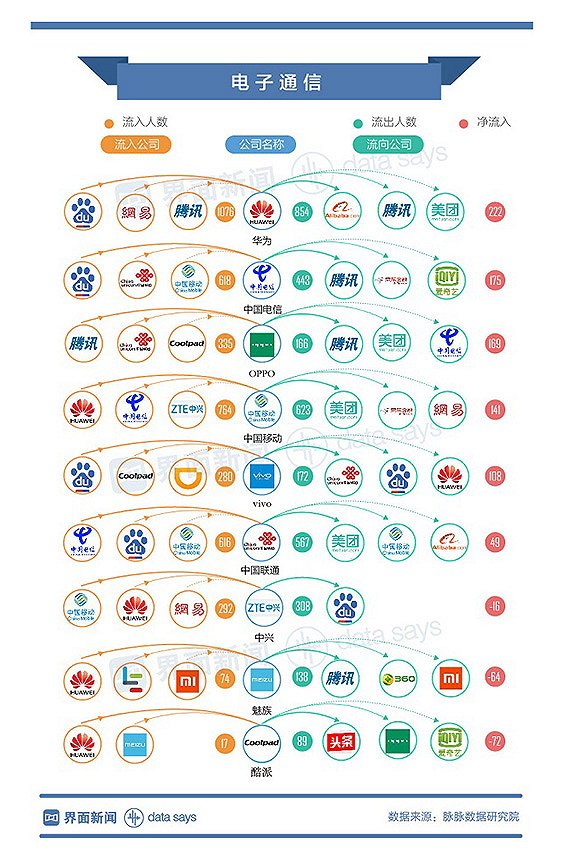 数据显示,中国移动、中国电信和中国联通三大运营商里,涌现了不少跳往互联网的出走者。而美团点评和腾讯是其中很多人才的新大陆。