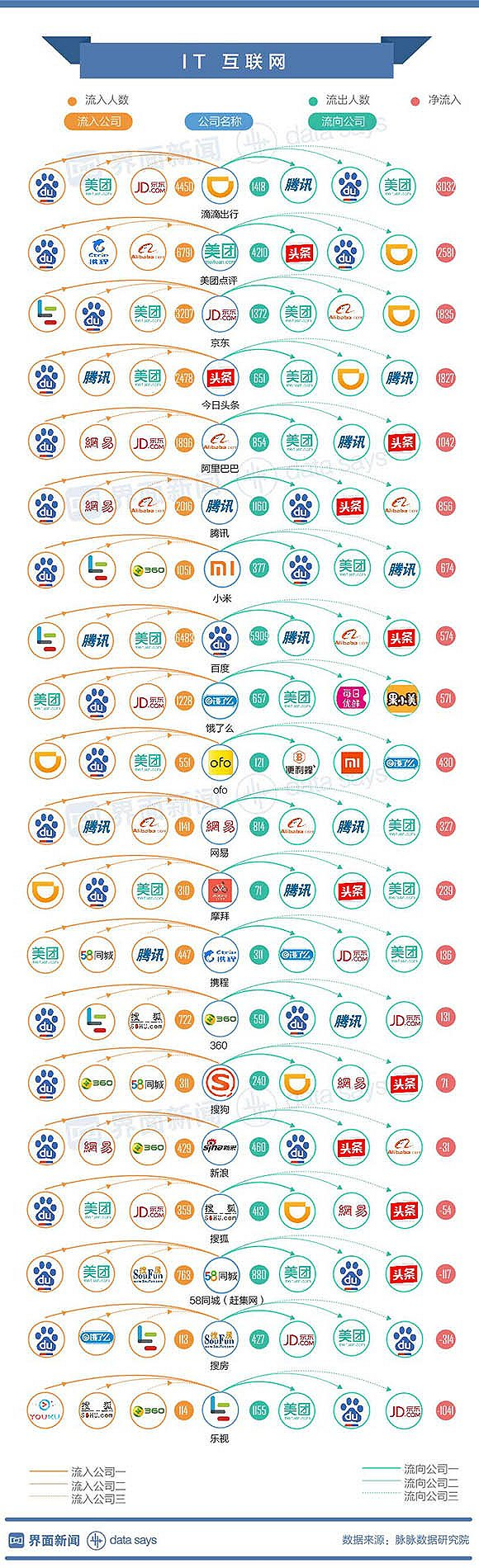 2016年,由于滴滴闯入,BAT三家并没形成闭环。到了2017年,腾讯和百度之间的人才流动倒变得更为密切,互相成为了彼此员工跳槽的第一大去处。