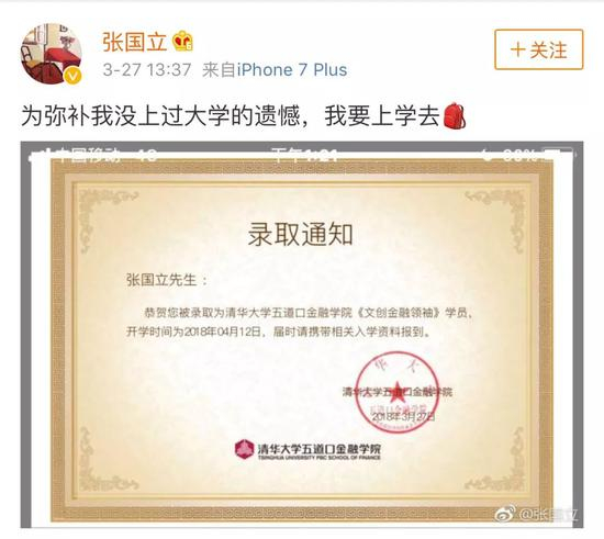 昨天下午,张国立发了条微博引发了网友的关注,文字容为:“为弥补我没上过大学的遗憾,我要上学去”。然后附上了一张来自“清华大学五道口金融学院”的录取通知书。
