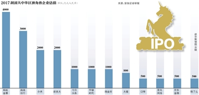 中金公司梳理的中国“独角兽”金字塔显示,第一梯队的为估值500亿美元以上的新经济企业,蚂蚁金服、小米和滴滴出行位列其中。第二梯队为估值100亿至500亿美元的企业,包括美团点评、今日头条、宁德时代、陆金所、菜鸟、京东金融、快手等8家;第三梯队的企业估值在50亿-100亿美元之间包括ofo小黄车、摩拜单车、爱奇艺等。截至2017年年底,中国有“独角兽”企业约124家。