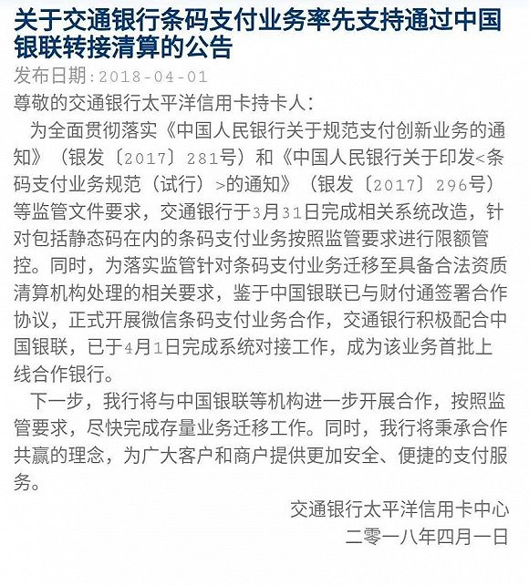 交通银行信用卡中心也在4月1日公告称交通银行的太平洋信用卡支付业务持通过银联转接清算。