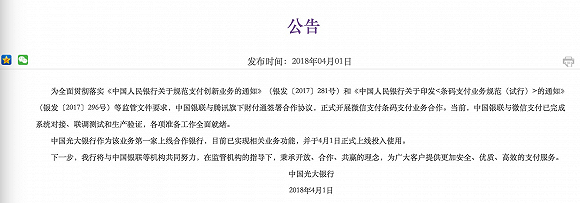 光大银行也在官方网站公告称,中国银联与微信支付已完成系统对接、联调测试和生产验证,各项准备工作全面就绪。中国光大银行作为该业务第一家上线合作银行,目前已实现相关业务功能,并于4月1日正式上线投入使用。