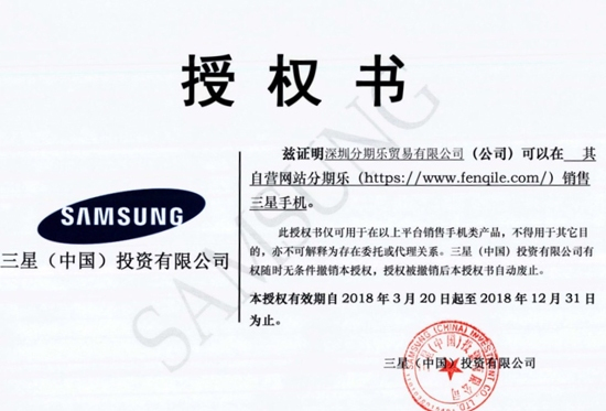 分期乐商城成为三星官方授权经销商