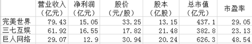 目前,完美世界、三七互娱、巨人网络均已交出了2017年成绩单,报告期内,三者营业收入分别为79.43亿元、61.92亿元和29.07亿元;同期净利润分别为15.05亿元、16.55亿元和12.9亿元。