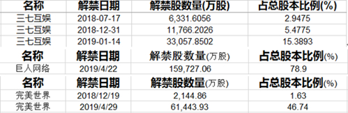 choice数据显示,完美世界、三七互娱、巨人网络未来均有大比例股份解禁,值得引起关注。