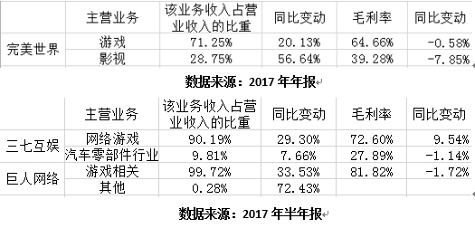 在游戏业务方面,除三七互娱以外,其余两家的游戏业务毛利率在2017年却均出现了下滑,完美世界下降0.58%,巨人网络下降1.72%。