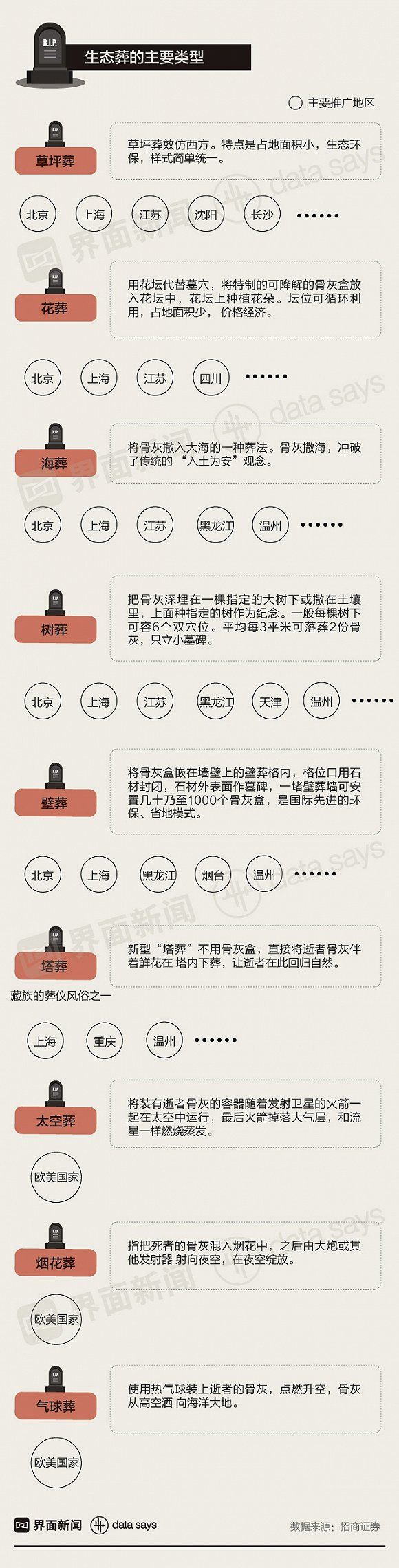 眼看着中国墓地资源越来越紧张,2016年2月,民政部、发改委、科技部和财政部等下发《关于推行节地生态安葬的指导意见》,开始大力推广生态葬。生态安葬主要包括树葬、海葬、花坛葬、壁葬、草坪葬等绿色生态殓葬方式。