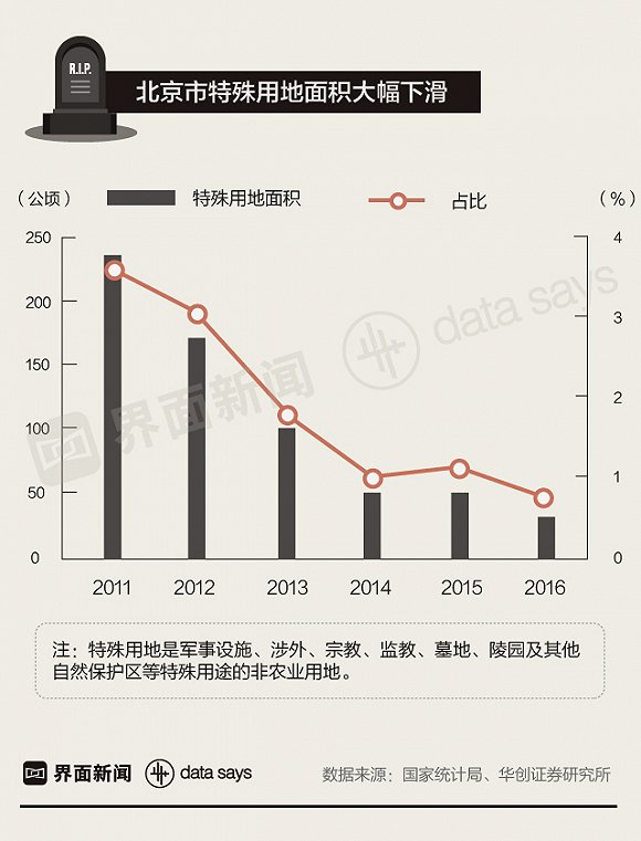 另一方面,国家对墓地资源的供给正在不断收紧。以北京为例,近几年的特殊用地面积已经大幅下滑。