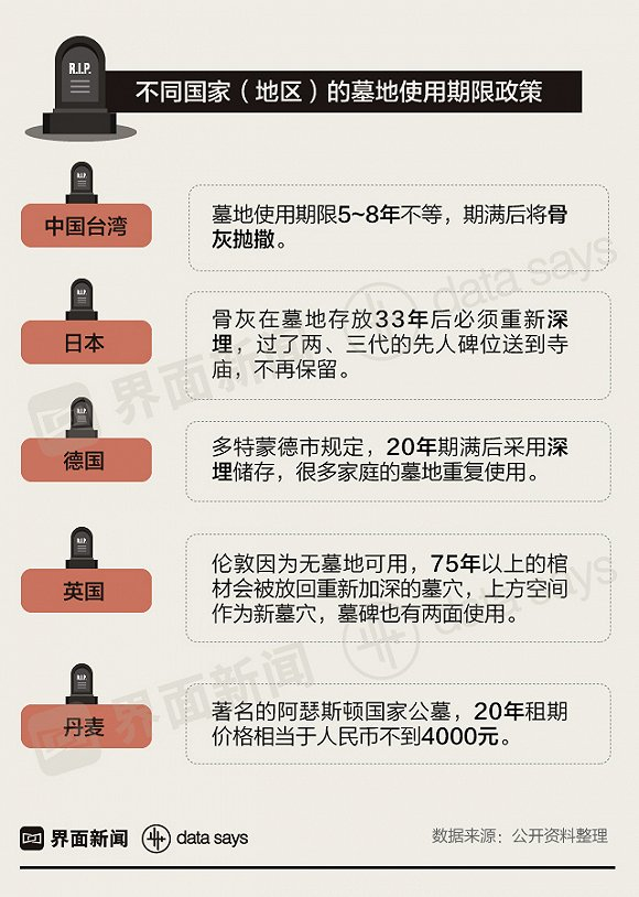 事实上,墓地使用期限并非中国首创,世界有不少国家(地区)很早就约定了墓地的使用期,以此来避免墓地资源枯竭。比如,日本、德国、英国等国家,都会在使用期满后将骨灰深埋或抛撒。