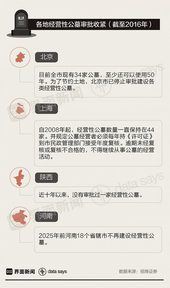 近三年,中国经营性公墓数量从1598个降至1386个,北京、上海、陕西、河南等多地都已停止审批建设经营性公墓。