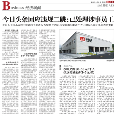 3月31日,本报A13版对今日头条广告违规一事进行了报道。