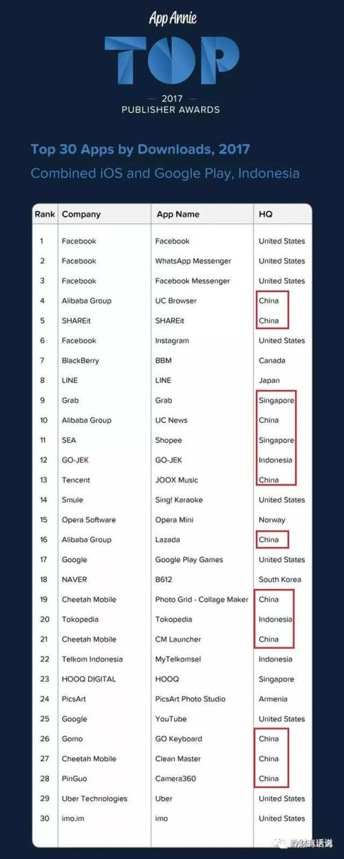 感受一下印尼的top 30 app,红框为中国公司、或者中资投资的。