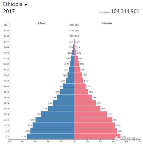 埃塞俄比亚是全球人口增长最快的国家之一。感受一下他的人口金字塔。埃塞俄比亚也曾经是全球最贫困、饥饿率最高的国家之一。
