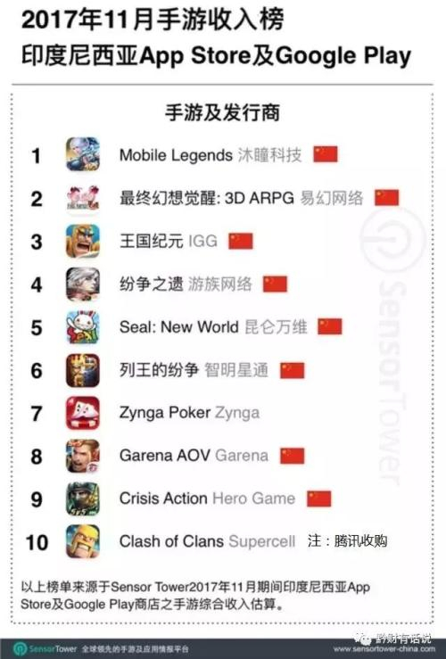 2017年,越南第1-4名的手游均来自中国,前10名手游有6款来自中国。占东南亚人口40%的印尼,其top10手游中来自中资的高达9款。