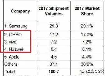 最后再感受下手机市场,下表为2017年东南亚手机市场份额,5强里中国公司占据3个位置: