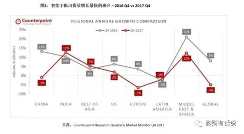 2017年,中国智能手机出货量同比下降了4%,国内市场已经饱和,而非洲和印度则继续保持双位数增长,是全球智能手机和上网人口增速最快的地区——类似5年前的中国,与之伴随的,就是各类互联网应用的蓬勃发展。