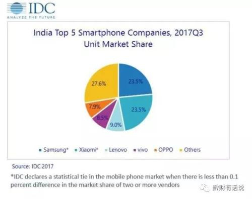 印度手机市场5强中,4家为中国公司,小米和三星并列印度市场第一。2017,小米手机出货量9240万部,同比去年增长3940万部,其中,小米的国内销量只增长了940万。也就是说,小米手机2017年的增量中,76%来自海外,其中主要来自印度——小米印度的营收同比增长了696%。2017Q3,小米在印度卖出了920万部手机。