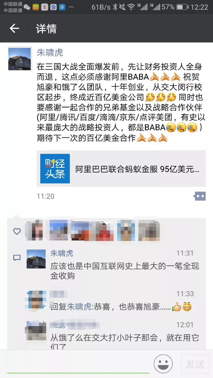 饿了么早期投资人朱啸虎在微信朋友圈点评称:在三国大战全面爆发前,先让财务投资人全身而退,这点必须感谢阿里BABA。