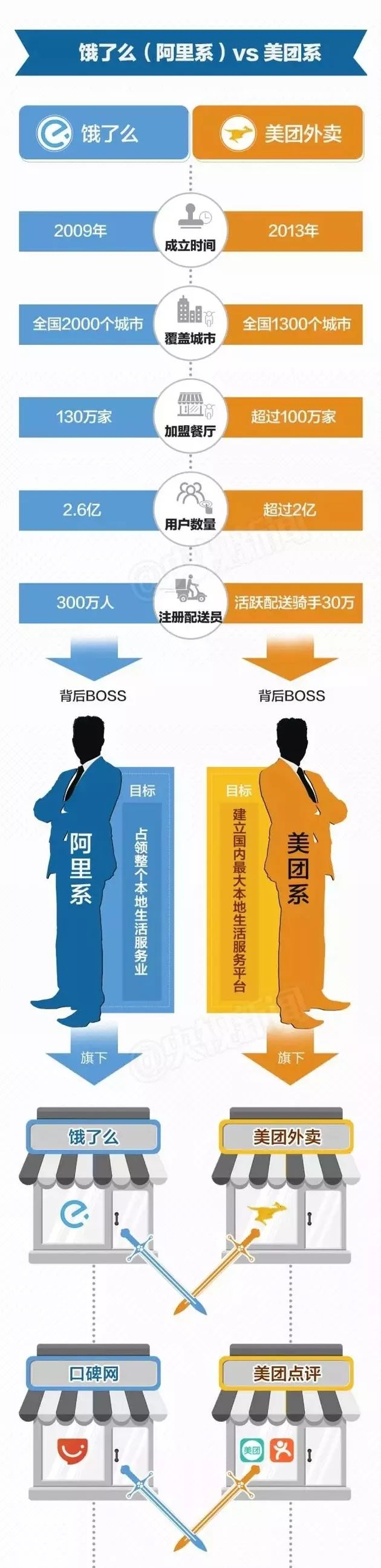 2016年,阿里站到了饿了么身后,不仅向其提供充足的“弹药”,还将饿了么与更名后的淘点点——口碑外卖打通,将到家业务交给饿了么,后者得以在战斗中存活下来。
