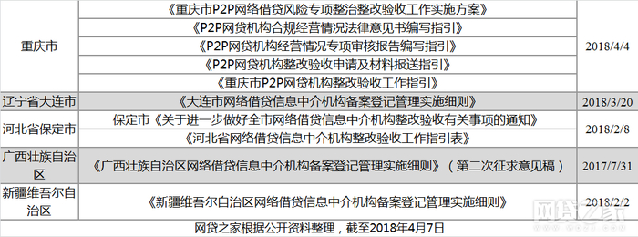 上海此前发布的《关于做好本市P2P网络借贷风险专项整治整改验收相关工作的通知》(也称“18号文”)提到,原则上网贷机构应于2018年3月底前完成整改并向注册地所在区整治办提交整改完成情况报告;个别情况极其复杂、整改难度极大的机构,最迟应于4月底之前完成相关工作。