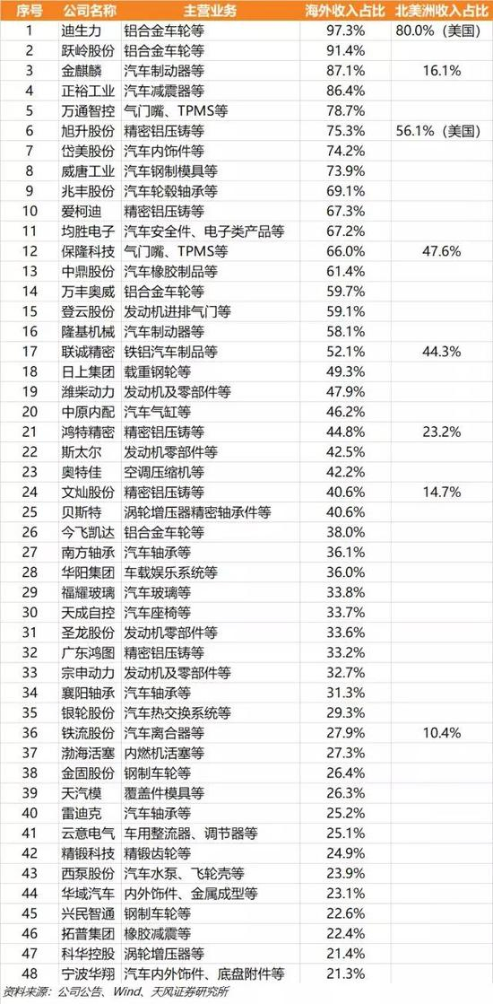 我们梳理出48家海外营收占比超20%的A股零部件上市公司。其中有8家公司披露了北美/美国营收占比,分别为迪力生(近80.0%)、旭升股份(56.1%)、保隆科技(47.6%)、联诚精密(44.3%)、鸿特精密(23.2%)、文灿股份(14.7%)、铁流股份(10.4%)。